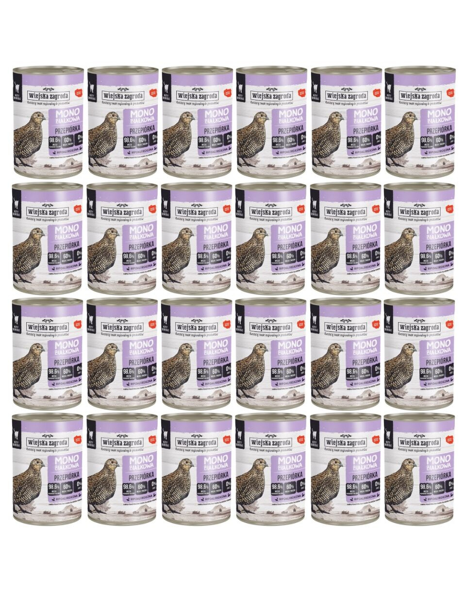 SKŁAD: 70 % przepiórka (60 % mięso, 10 % wątroba), 28,6 % bulion z przepiórki, 1 % składniki mineralne, 0,2 % olej z łososia, 0,1 % drożdże piwne suszone, 0,1 % ekstrakt Yucca Mojave.