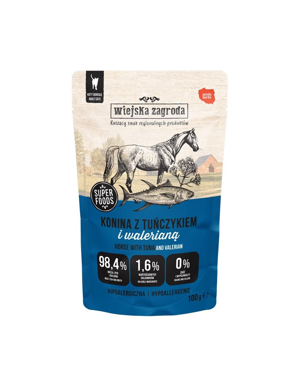 Szukasz zdrowej i smakowitej mokrej karmy dla kota w formie delikatnego, aromatycznego pasztetu? Wiejska Zagroda Konina z tuńczykiem z dodatkiem waleriany to połączenie mięsa, podrobów i superfoods, które zachwyci każdego kociego smakosza. Saszetki zawierają aż 98,4% mięsa, podrobów oraz bulionu, a także olej z łososia, spirulinę, walerianę, drożdże iwne oraz prebiotyki MOS i FOS, które dodatkowo wspierają zdrowie Twojego kota.