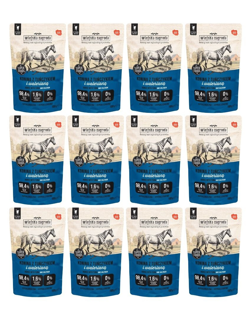 Szukasz zdrowej i smakowitej mokrej karmy dla kota w formie delikatnego, aromatycznego pasztetu? Wiejska Zagroda Konina z tuńczykiem z dodatkiem waleriany to połączenie mięsa, podrobów i superfoods, które zachwyci każdego kociego smakosza. Saszetki zawierają aż 98,4% mięsa, podrobów oraz bulionu, a także olej z łososia, spirulinę, walerianę, drożdże iwne oraz prebiotyki MOS i FOS, które dodatkowo wspierają zdrowie Twojego kota.