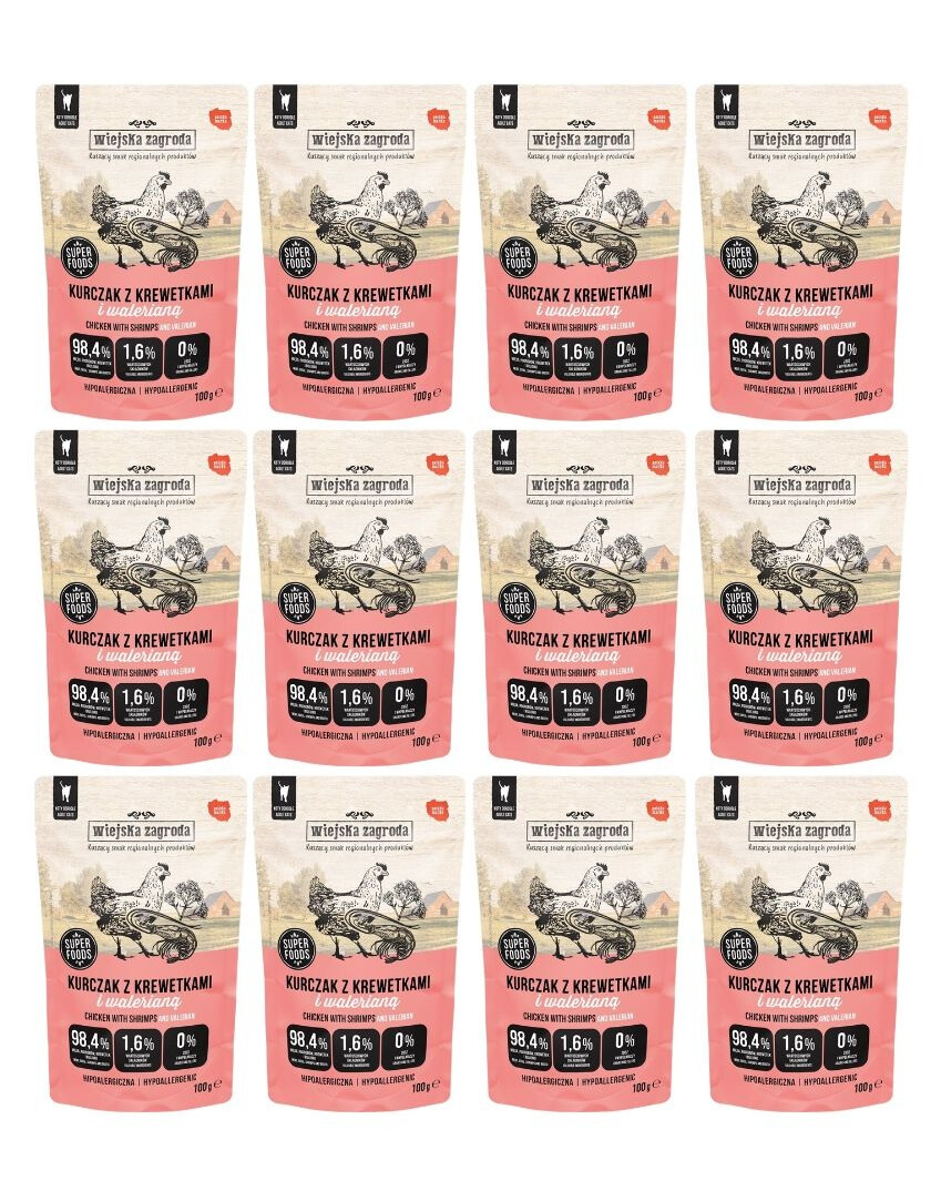 WIEJSKA ZAGRODA Superfoods Kurczak z krewetkami i walerianą mokra karma dla kota 12x100 g