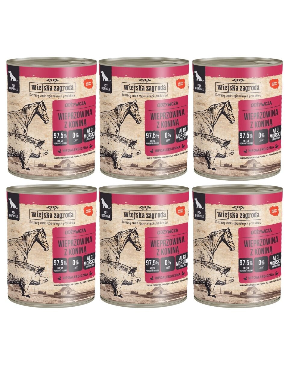 Podstawą posiłku jest zatem duet starannie wybranych mięs oraz podrobów. To najważniejsze i najbardziej wartościowe składniki, które zatopione są w aromatycznym bulionie. Połączenie wieprzowiną z lekkostrawną koniną są świetnym wyborem dla psów, szczególnie tych aktywnych.