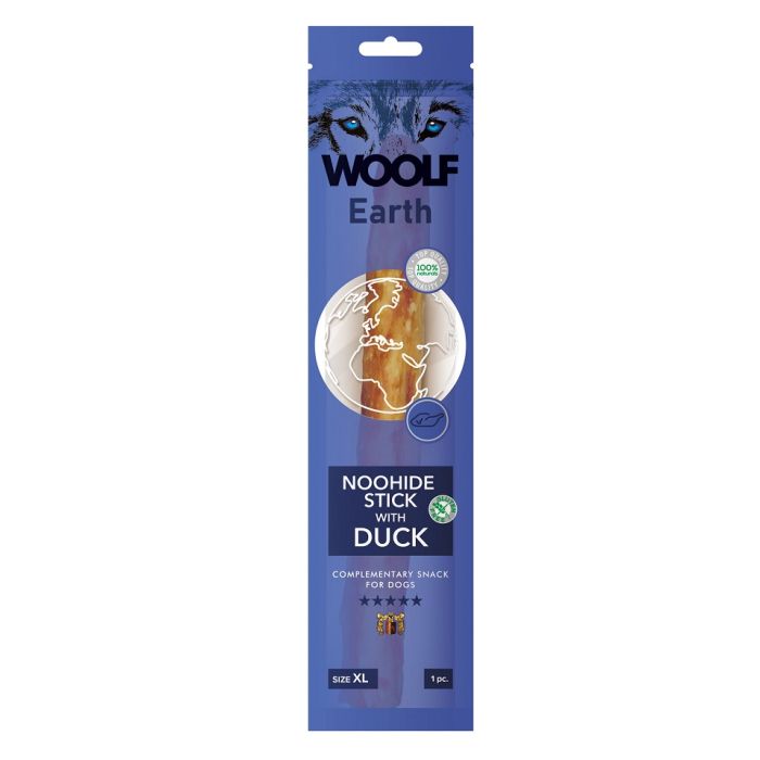 WOOLF EARTH NOOHIDE to przysmaki w kształcie twardych pałeczek z żelatyny z dodatkiem mięsa kaczki.