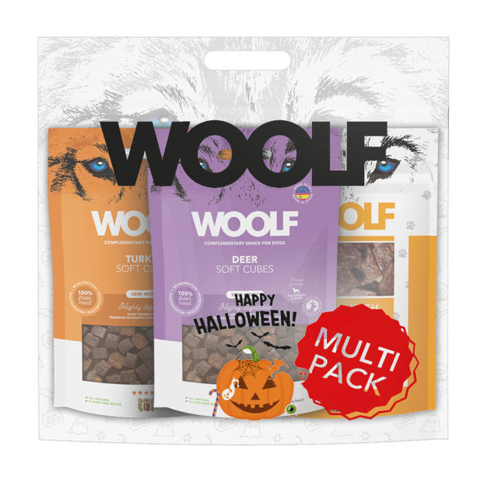 Zaskocz swojego psa czymś wyjątkowym w klimacie Halloween — WOOLF Multipack Halloween to zestaw smakołyków, który łączy radość, zabawę i bezpieczeństwo. Idealny jako upominek lub sezonowa przekąska na jesienne spacery czy imprezy tematyczne.