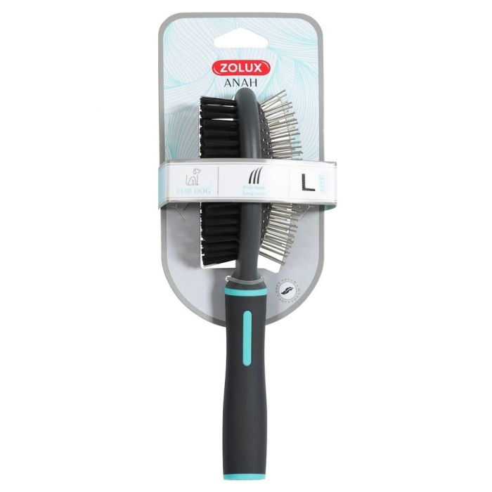 SZCZOTKA DWUSTRONNA DUŻA - metalowe igły umożliwiają szczotkowanie gęstej sierści i delikatne jej rozczesywanie. Nylonowa część doskonale wygładza, pozostawiając lśniącą sierść.