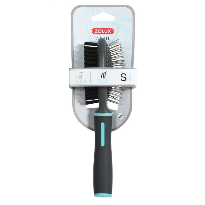 SZCZOTKA DWUSTRONNA MAŁA - metalowe igły umożliwiają szczotkowanie gęstej sierści i delikatne jej rozczesywanie. Nylonowa część doskonale wygładza, pozostawiając lśniącą sierść.