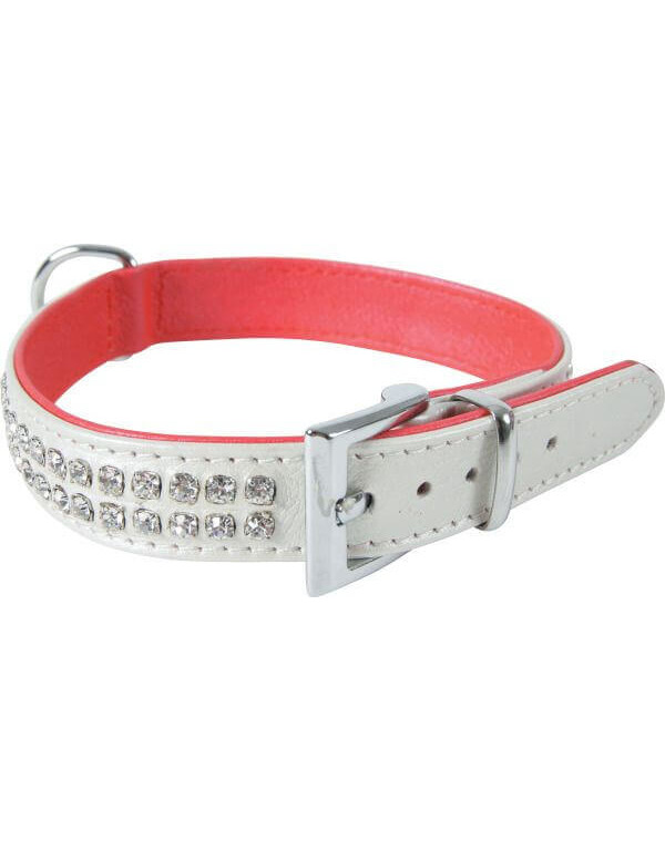 Gama skórzanych obroży. Seria składa się z obroży z dwoma rzędami strasów. Najwyższa jakość: 100 % skóry wołowej i nowe strasy, jeszcze bardziej błyszczące. Podwójna skóra czerwona i perłowa.
