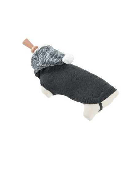 Ciemnoszare ubranie, posiada kaptur w pipetkę z białym pomponem oraz miejsce na przypięcie smyczy. Wycięcia na łapy zaczkończone są ściągaczami, dla lepszego dopasowania ubranka. Sweterek wykonany z akrylowej włóczki. Zaprojektowany z myślą o komforcie psa i nie krępowaniu jego ruchów. Ubranie może być zakładane jako pojedyncze okrycie wierzchnie lub pod kurteczkę czy płaszczyk dla bardzo wrażliwych na niskie temperatury psów.